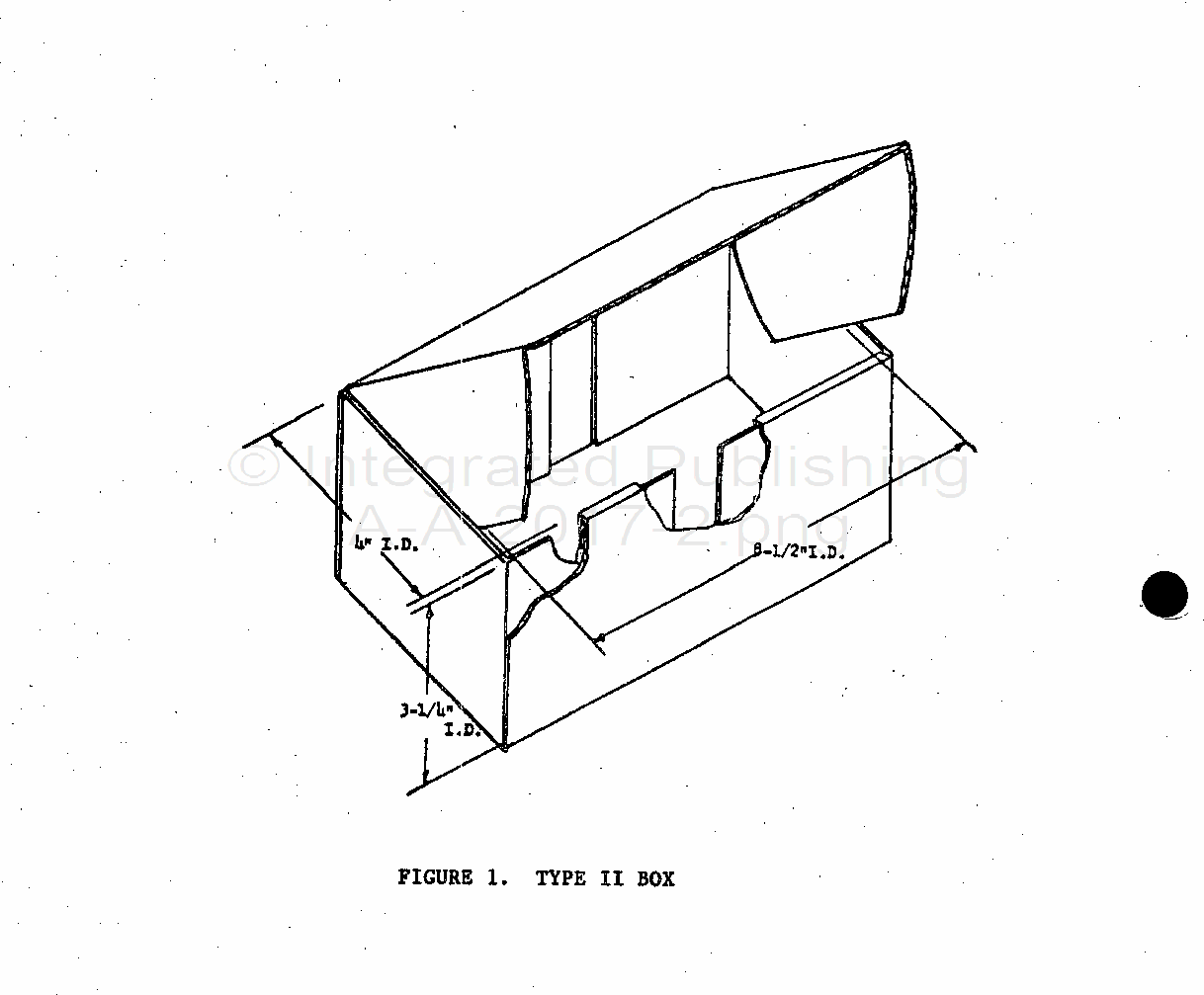 A-A-2017 Box, Fiberboard, Special Use (Post Office Money Order Forms)This description covers Post Office Money Order Forms Box, Type II. Type II shall be one-piece, tuck-end style (OPTE), modified as shown in figure 1. The size shall be inside dimensions, in inches, as follows, with a tolerance of minus 0, plus 3/16 inch. Lenght 8-1/2 Width 4 Depth 3-1/4